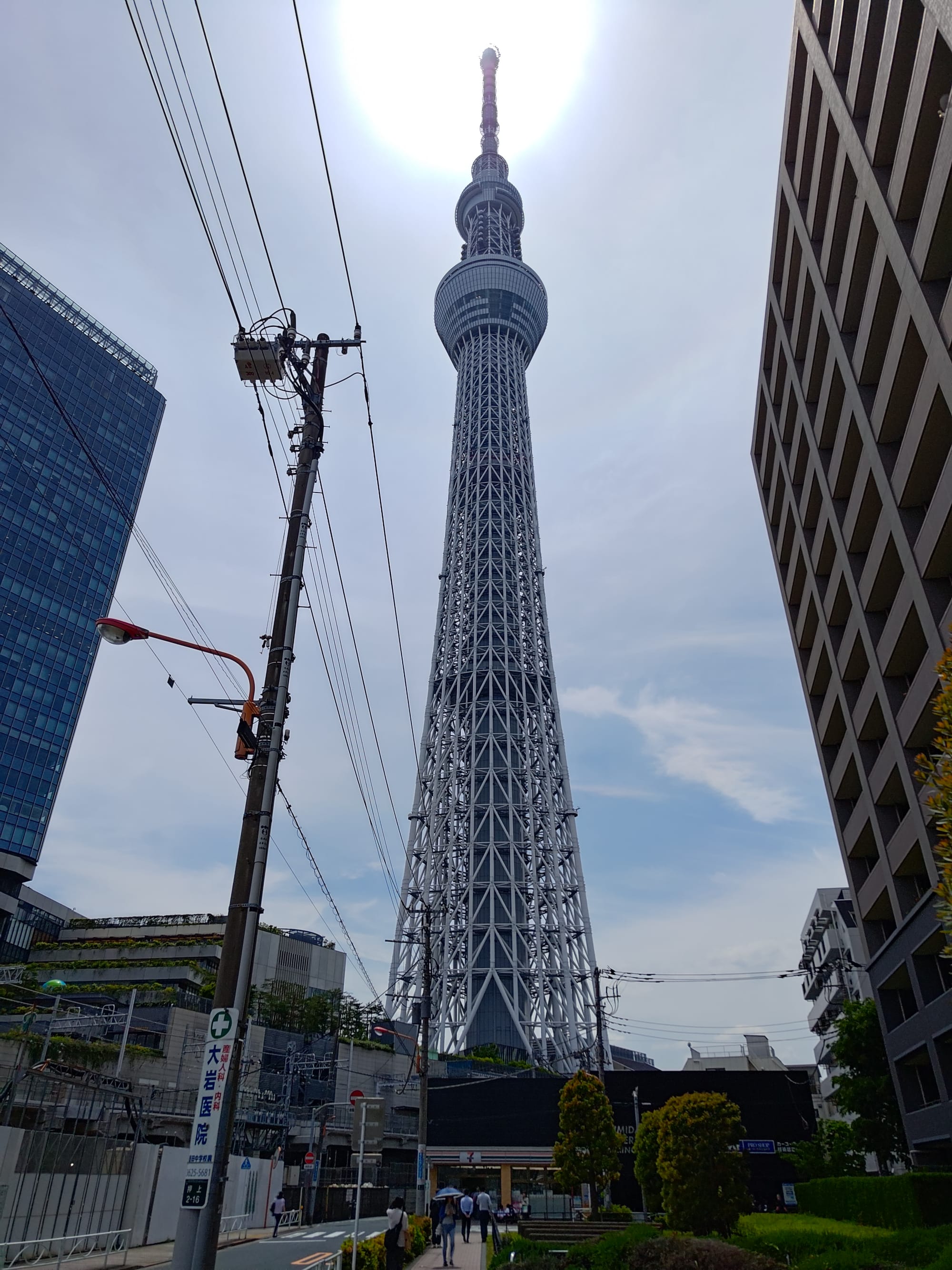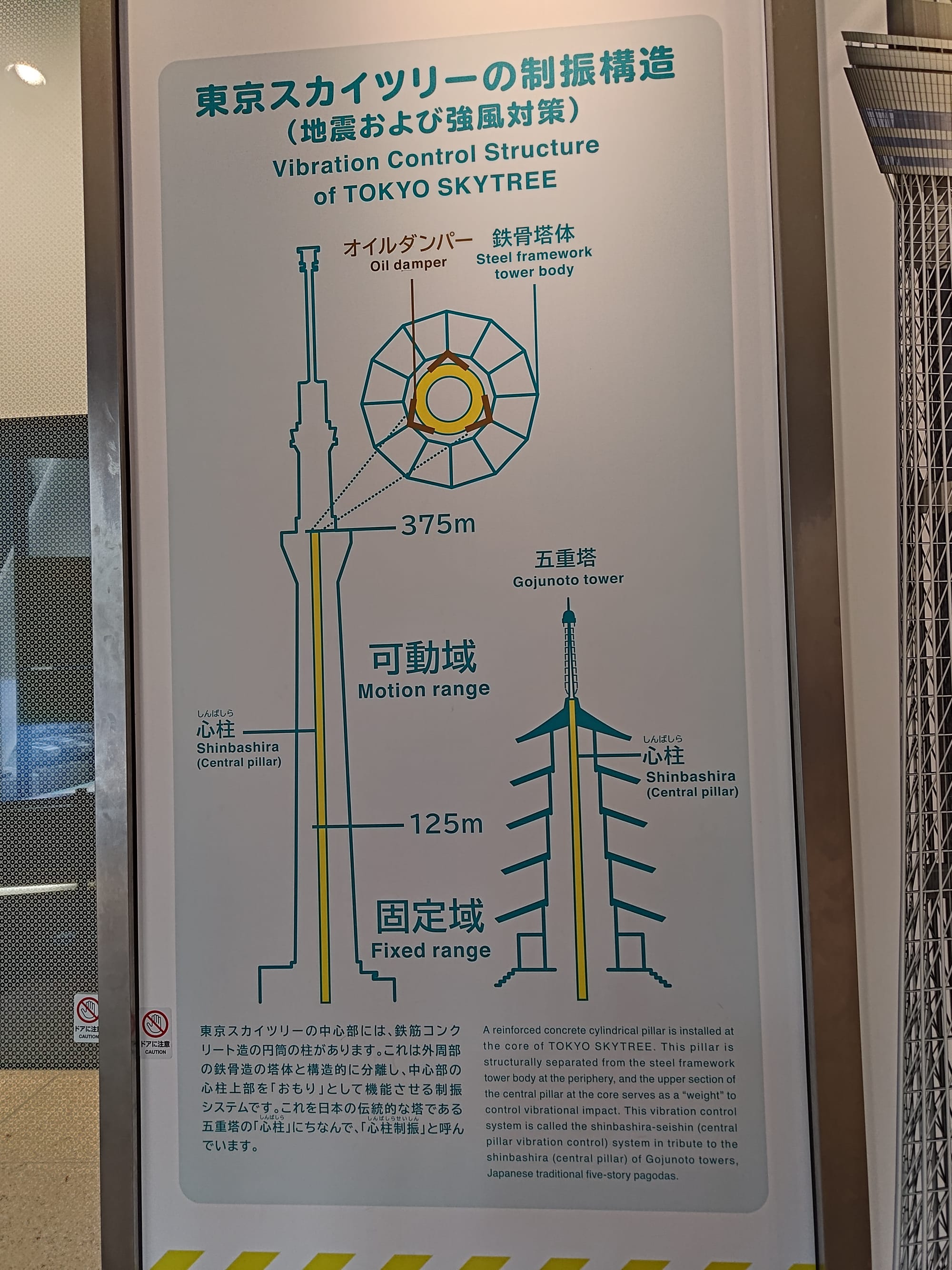 Viens ensuite la Tokyo Skytree (oui, encore une tour, mais c'est la dernière). Plus haute tour du Japon avec 634 m, le premier observatoire se trouve à 350 m de haut et le second à 450 m de haut. Elle a été construite en 2011 dans l'objectif d'avoir une nouvelle tour radio, la Tokyo Tower n'étant plus assez haute à cause de certains immeubles toujours plus grands. Sa base triangulaire se change peu à peu pour être ronde au sommet et donc avoir un minimum de prise au vent par tous les côtés et tout en ayant une bonne empreinte au sol. Toute la tour a été construite autour d'une masse géante pour amortir les vibrations en cas de tremblements de terre, comme cela se faisait déjà dans les pagodes traditionnelles. Pour soutenir le tout, les tubes à la base de la tour font plus de 2 m de diamètre et 10 cm d'épaisseur.