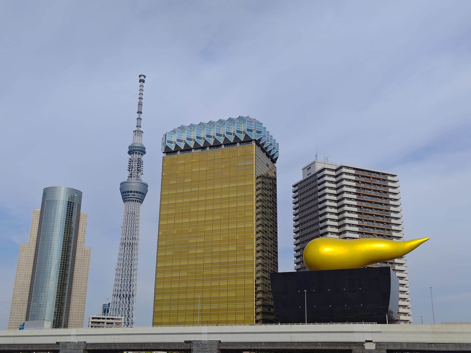 Une petite pause le long de la rivière Sumida-Gawa, le temps d'admirer cette "magnifique" oeuvre qu'est le Kin no unko. Littéralement, le Caca doré, son vrai nom est la Asahi Flame et elle est censée représenté le cœur brûlant de la marque de bière Asahi à qui appartient le bâtiment... Raté. Cette réalisation est signée Philippe Starck, yeah !