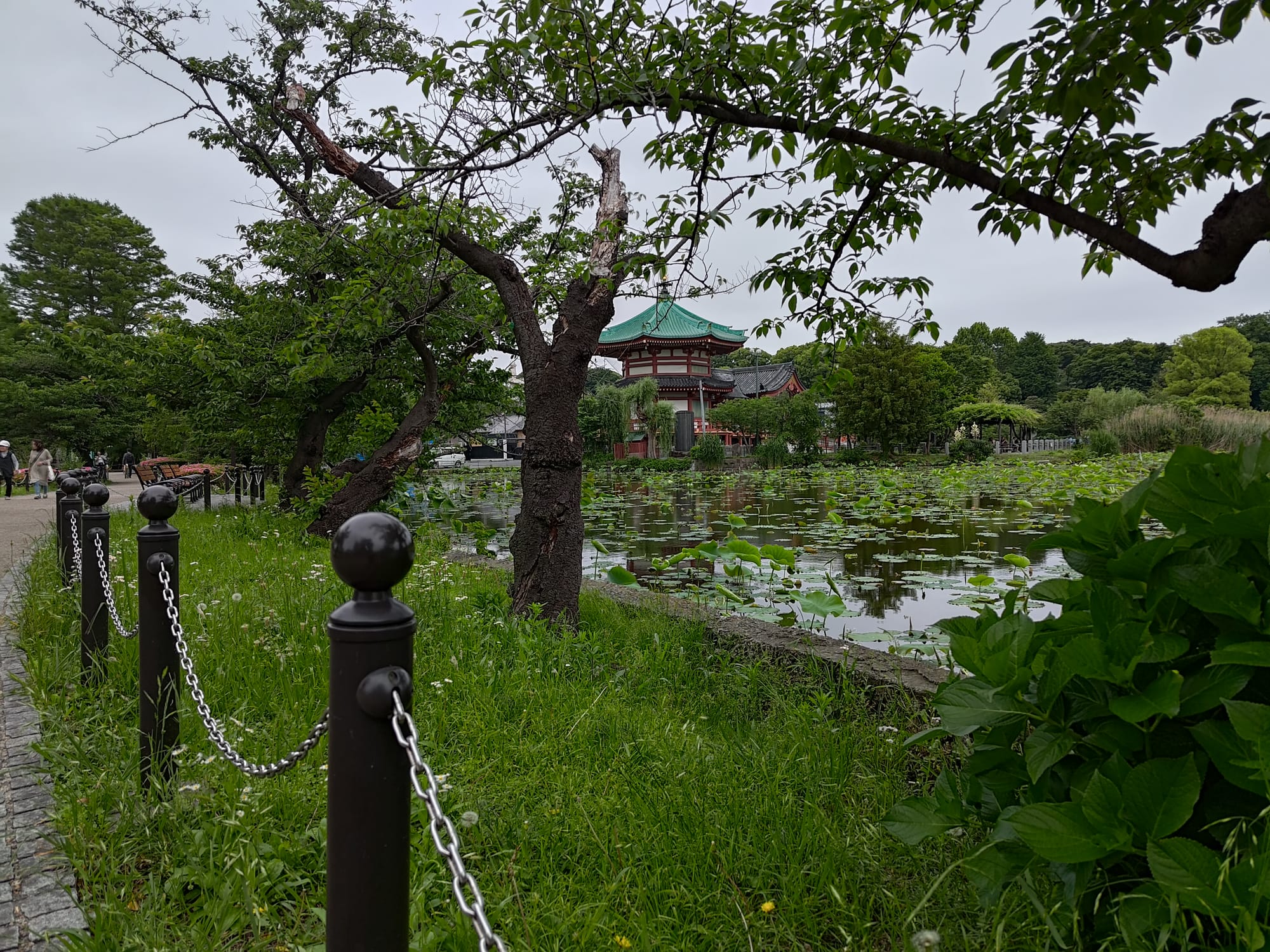A côté du parc se trouve un temple posé sur une grande mare : le Shinobazuno Pond Benten. Il a la particularité d'avoir été construit sur une île artificielle créée pour l'occasion. Depuis sa construction il a été relié à la rive par un pont et deux digues dont l'une est entourée de cerisiers. Avec les reste des plantes mis en place ce doit être un endroit magnifique en Avril. Comme beaucoup de choses, le temple actuel n'est qu'une reconstruction de l'originel détruit lors des bombardements.