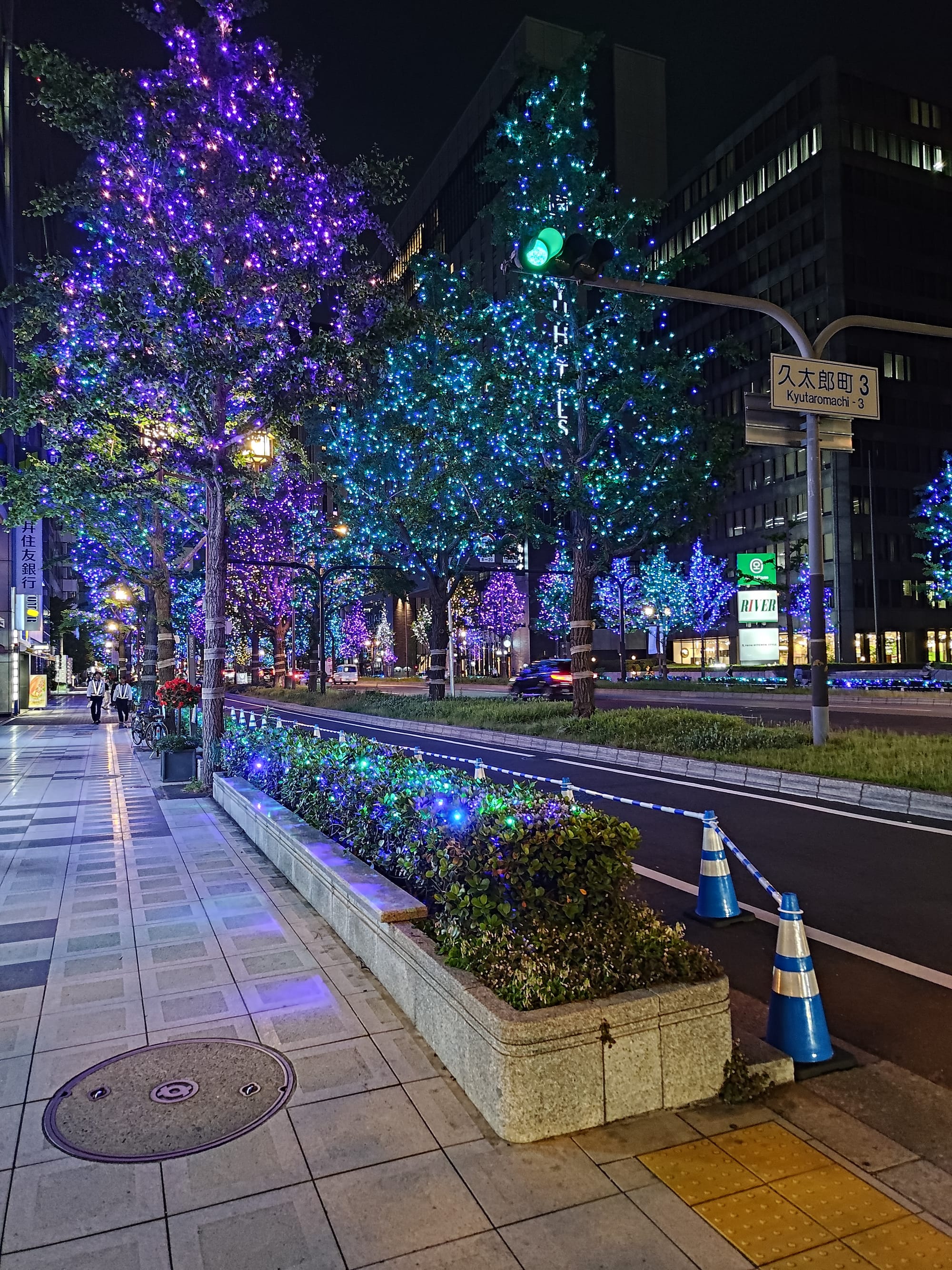 Et justement, après une bonne sieste je pars chercher à manger et découvre une ville de nuit qui n'a rien à voir avec la ville de jour. Déjà, presque tous les commerces, y compris de bouche, ont fermé (mais ça ne m'a pas empêché de trouver le meilleur ramen que j'ai fait jusqu'à présent). Mais surtout, la grande rue située 50 m plus loin (qui n'est pas du tout commerçante car il n'y a que des immeubles de bureaux) a été magnifiquement éclairée. Je profite un peu de la vue, mais ne tarde pas à rentrer car demain je vais à l'Exposition Universelle.