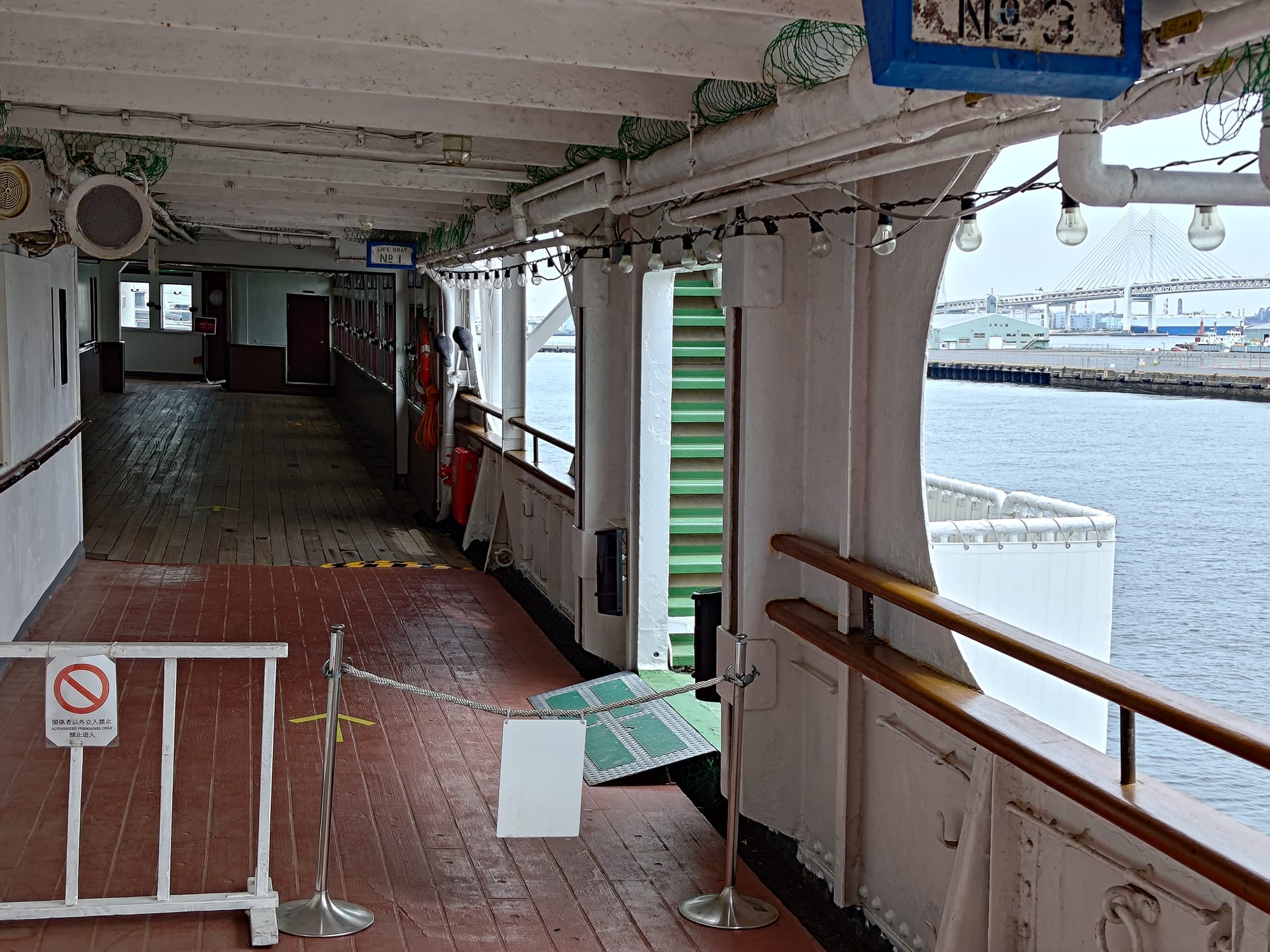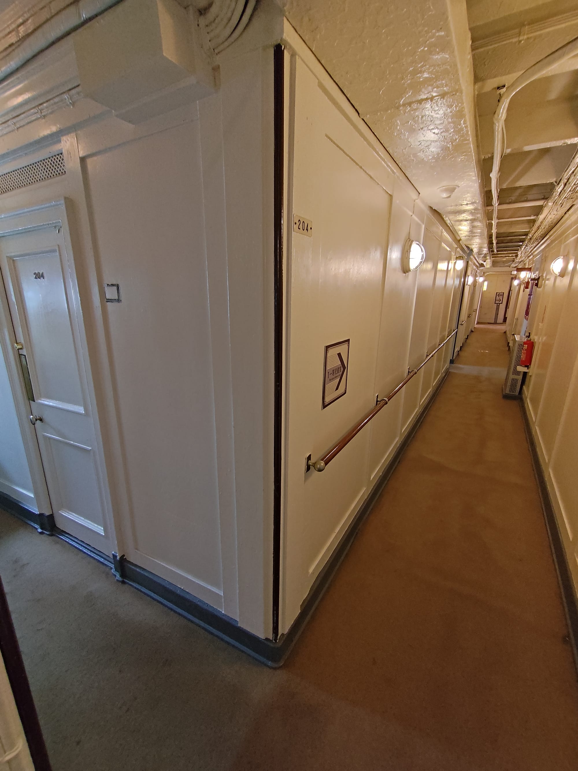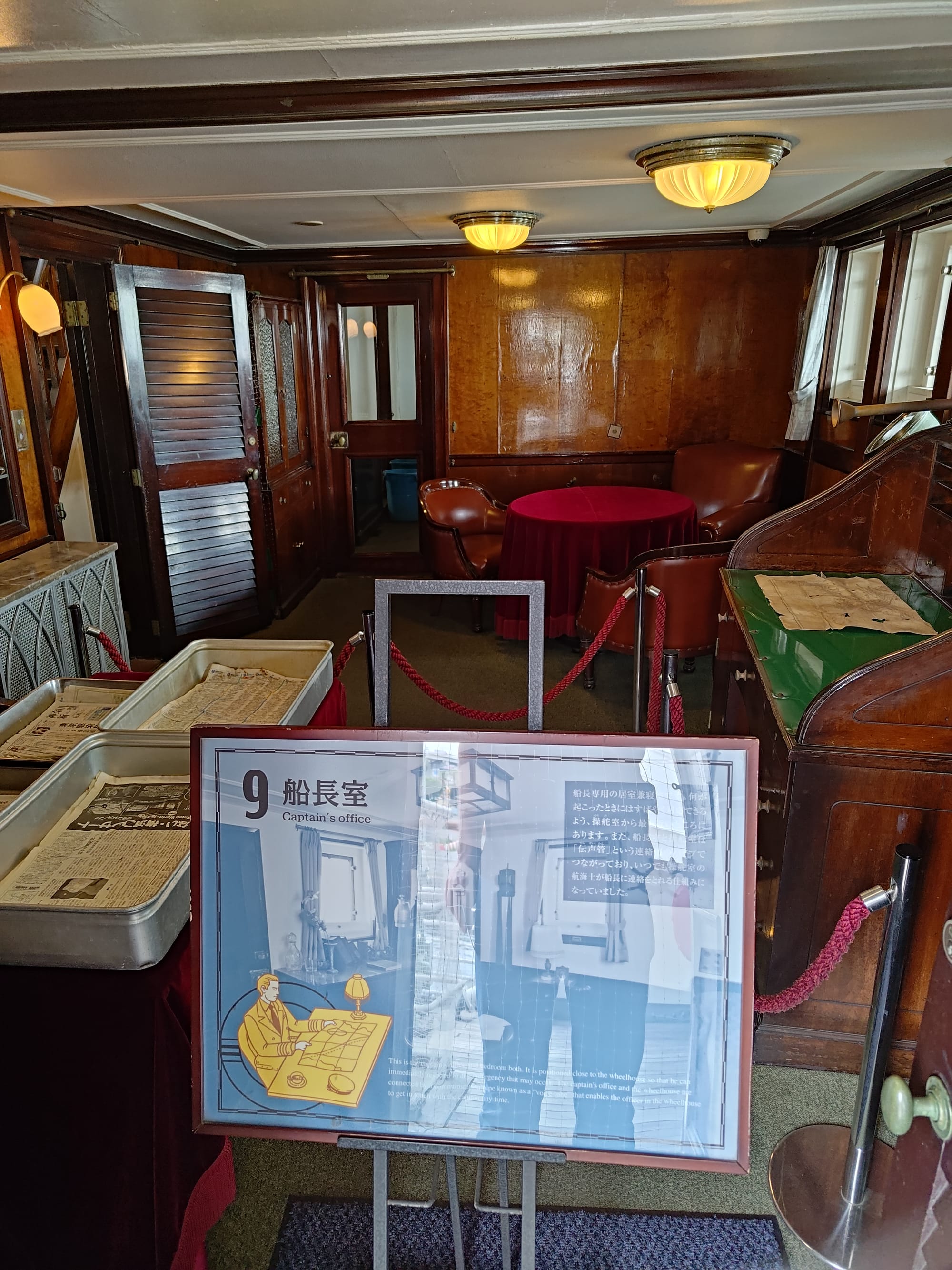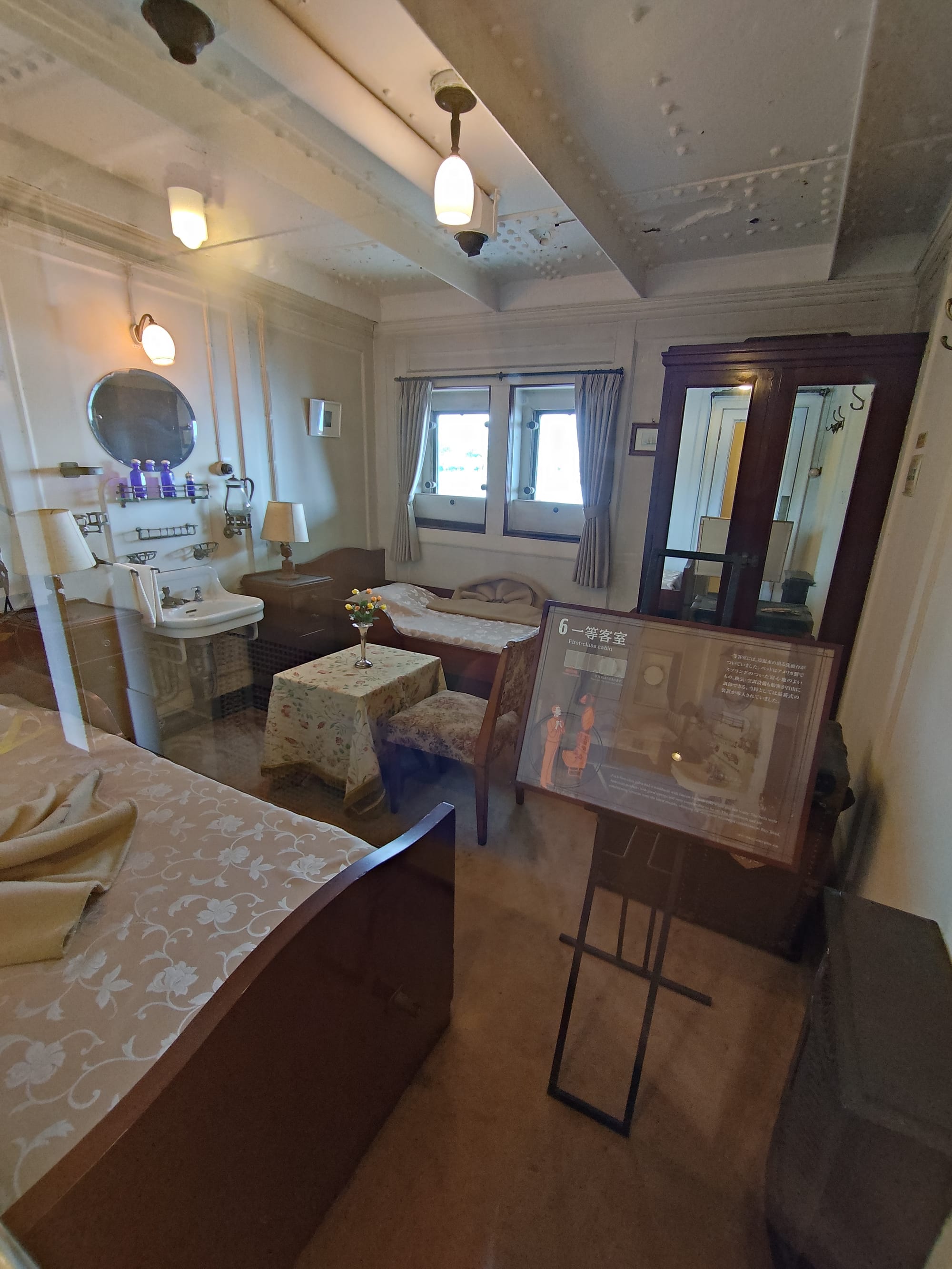 Du coup, plus loin il y a le Hikiwa Maru (ou Hikiwamaru, ils mettent les deux sur le prospectus), un vieux navire de croisière qui peut être visité. Construit en 1930 pour faire l'aller-retour entre Yokohama et les Seattle, il a été utilisé en navire hôpital lors de Seconde Guerre Mondiale avant de revenir à sa fonction initiale jusqu'en 1953. A l'intérieur, trois classe plus une suite impériale (qui a réellement servi à la famille impériale, plus précisément le prince) avec chambre, salon et salle de bain.