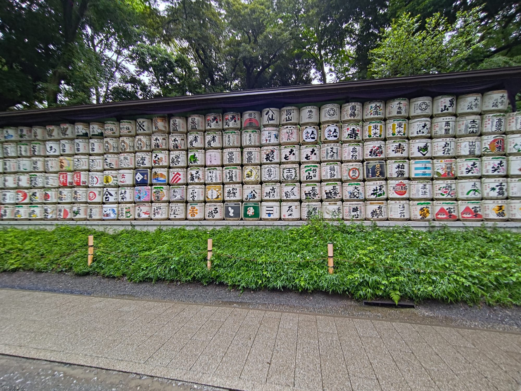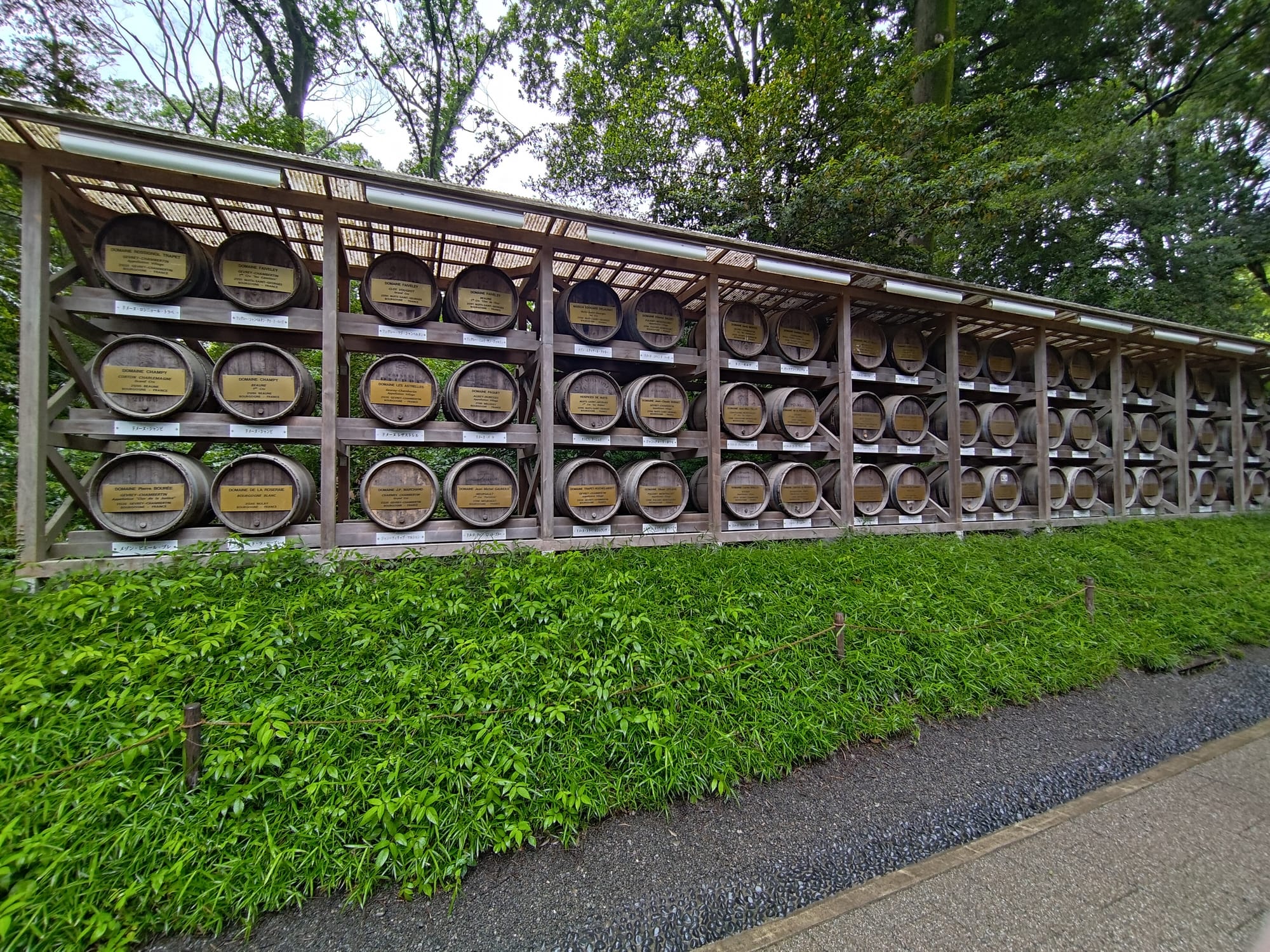 Sur le chemin du temple il y a une petite particularité : des bidons de saké offerts par différents fabricants afin d'honorer le temple, et en face des tonneaux de vin français (de Bourgogne) offerts à l'initiative d'un Japonais installé en France pour marquer les relations entre les deux pays.