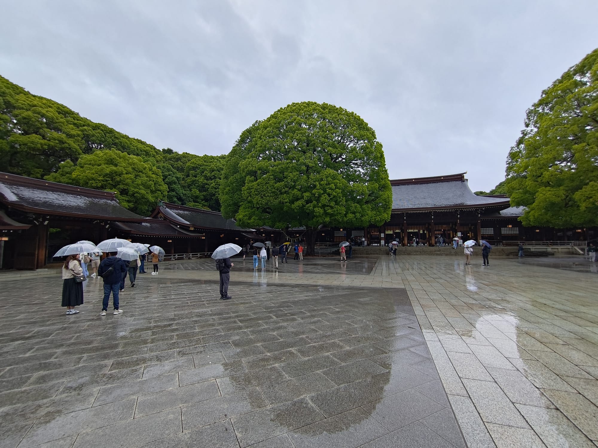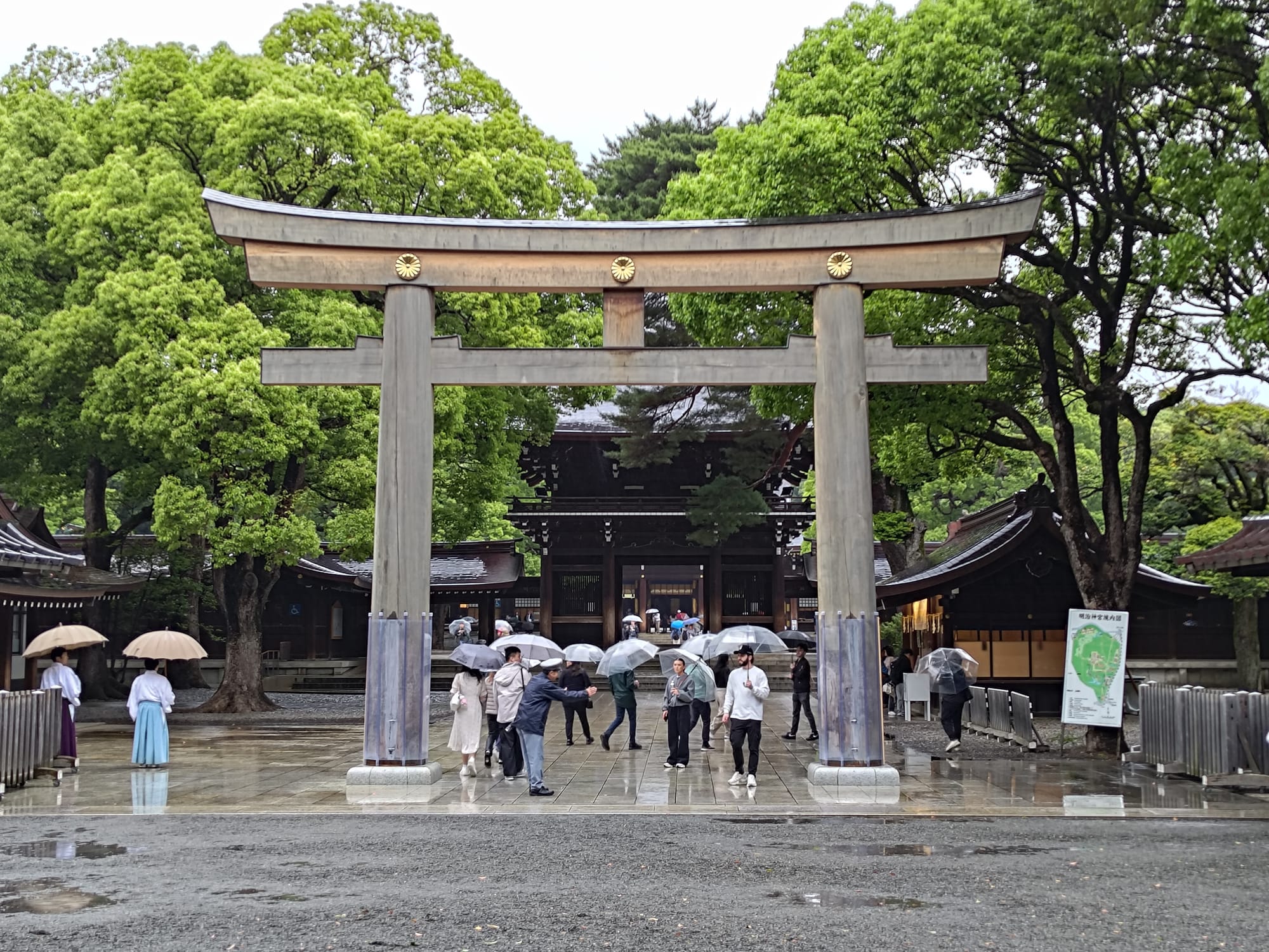 Bon, je crois que la saison des pluies est définitivement arrivée. Bon, je prend le parapluie, le sac et les chaussures sont plutôt étanches, direction le sanctuaire Meiji. Il a été construit en 1915 pour rendre honneur à l'Empereur Meiji et son épouse décédés quelques années plus tôt. Aujourd'hui encore il est très actif puisque différentes cérémonies se tenaient quand j'y étais (des moines qui priaient, des parents venus avec leur nouveau-né...).